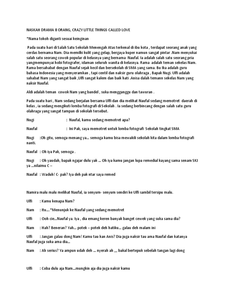 Naskah drama 8 orang sahabat. Contoh naskah drama 8 -5. Lukman setiawan narrator. NASKAH DRAMA 8 ORANG CRAZY LITTLE THINGS CALLED LOVE Nama tokoh diganti sesuai keinginan Pada suatu hari di Salah Satu Sekolah Menengah Atas terkenal di ibu kota terdapat seorang anak yang cerdas bernama Nam.
